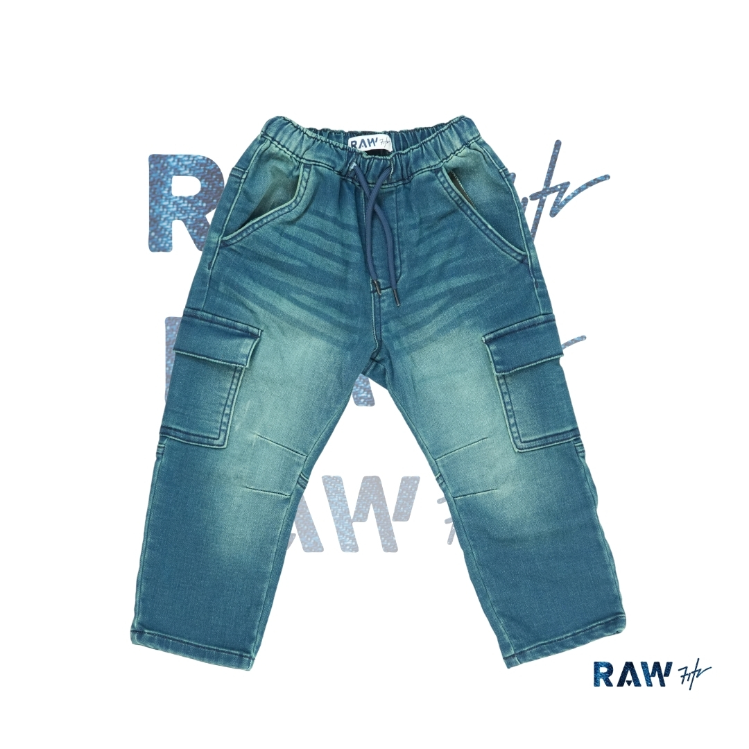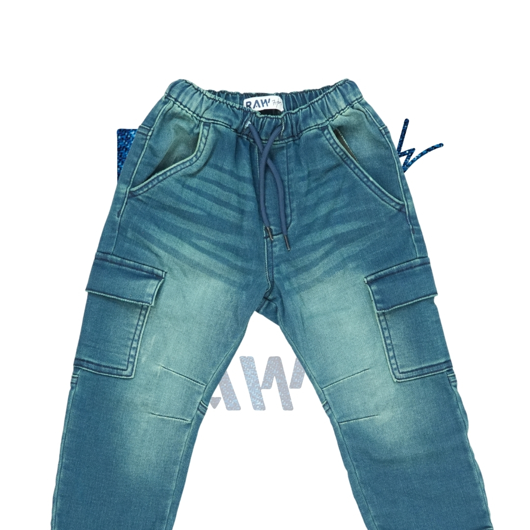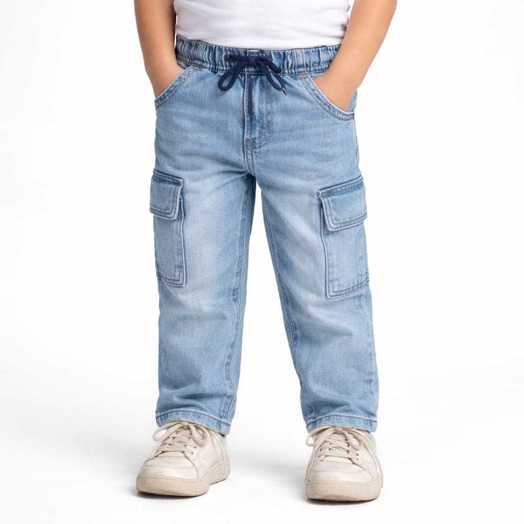 Give your little one's everyday look a stylish update with our Kids' Faded Medium Wash Cargo Joggers. Designed for busy, active days, these easy pull-on denim pants feature a comfortable elastic waistband with an adjustable navy drawstring to ensure a perfect fit. The vintage-inspired medium blue wash is highlighted by trendy fading across the front, while practical side and cargo pockets add a classic utility vibe. Crafted from soft, flexible denim, they provide all-day comfort for playtime and beyond